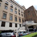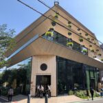 美術館のファサード(前面)です。淡い色のレンガに、玄関には洋風の白い丸柱が施されています。玄関の窓のデザインも、アールデコを思い起こさせるような洋風のデザインがなされています。